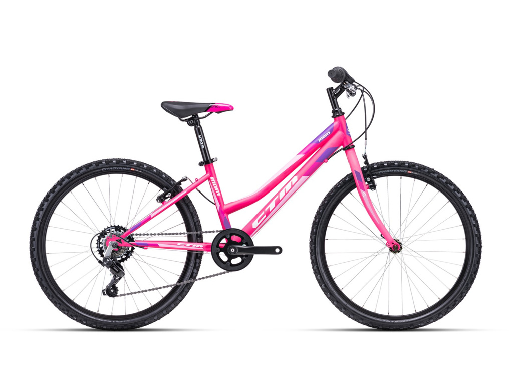 Dievčenský horský bicykel CTM Mony na každodennú jazdu. Je vhodný pre deti s telesnou výškou od 125 do 145 cm. Bicykel je vybavený oceľovým rámom, pevnou vidlicou, V-brzdami a komponentmi Shimano s prevodmi 1x6.