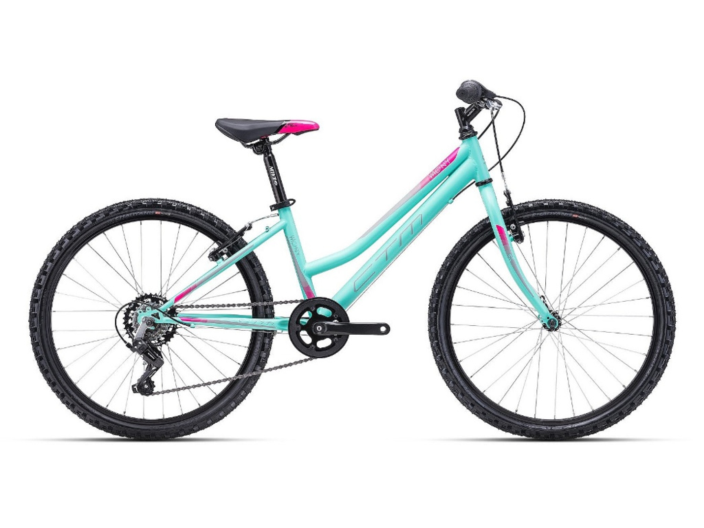 Juniorský horský bicykel CTM Mony na každodennú jazdu, pre mladé dámy s výškou od 125 do 145 cm. Bicykel je vybavený oceľovým rámom, pevnou vidlicou, brzdami V-ramena a komponentmi Shimano s jednorýchlostným prevodníkom a 7 prevodmi.