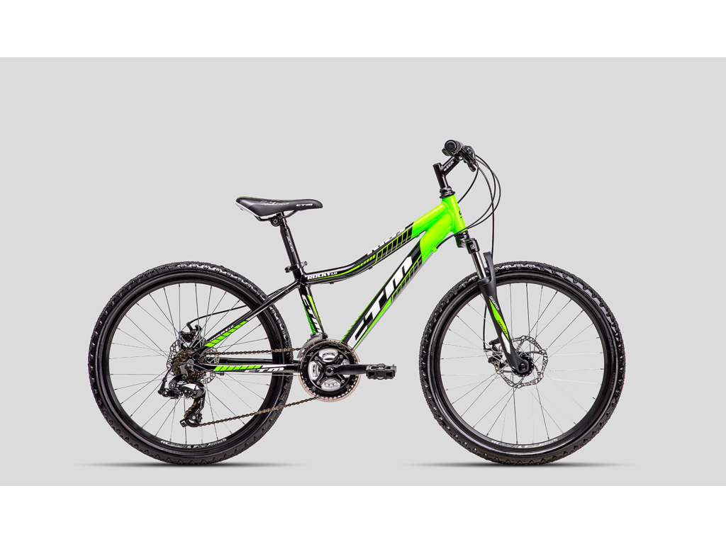 Detský bicykel CTM Rocky 3.0 s 24" kolesami je vhodný pre deti vysoké 120 až 145 cm. Bicykel má ľahký hliníkový rám, odpruženú vidlicu Suntour XCT, mechanické kotúčové brzdy a komponenty Shimano s prevodmi 3x7.
