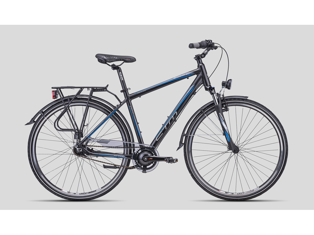 Pánsky trekingový bicykel CTM STAMP 2.0, vhodný na jazdu po meste a dlhé výlety v prírode. Odolný Alu rám je vybavený komponentmi Shimano s radením Nexus so 7 prevodmi a ráfikovými brzdami. Štandardná výbava zahŕňa aj predné a zadné osvetlenie, nosič