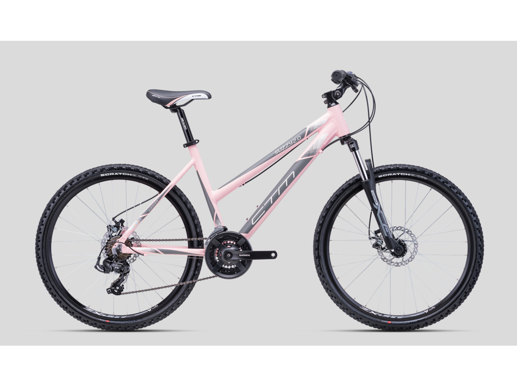 CTM Suzzy 2.0 je dámsky horský bicykel ideálny na jazdu na trailoch a začiatky v teréne. Ľahký hliníkový rám je vybavený odpruženou vidlicou Suntour so 100 mm zdvihom, komponentmi Shimano s 3x7 prevodmi a kotúčovými brzdami Hayes.