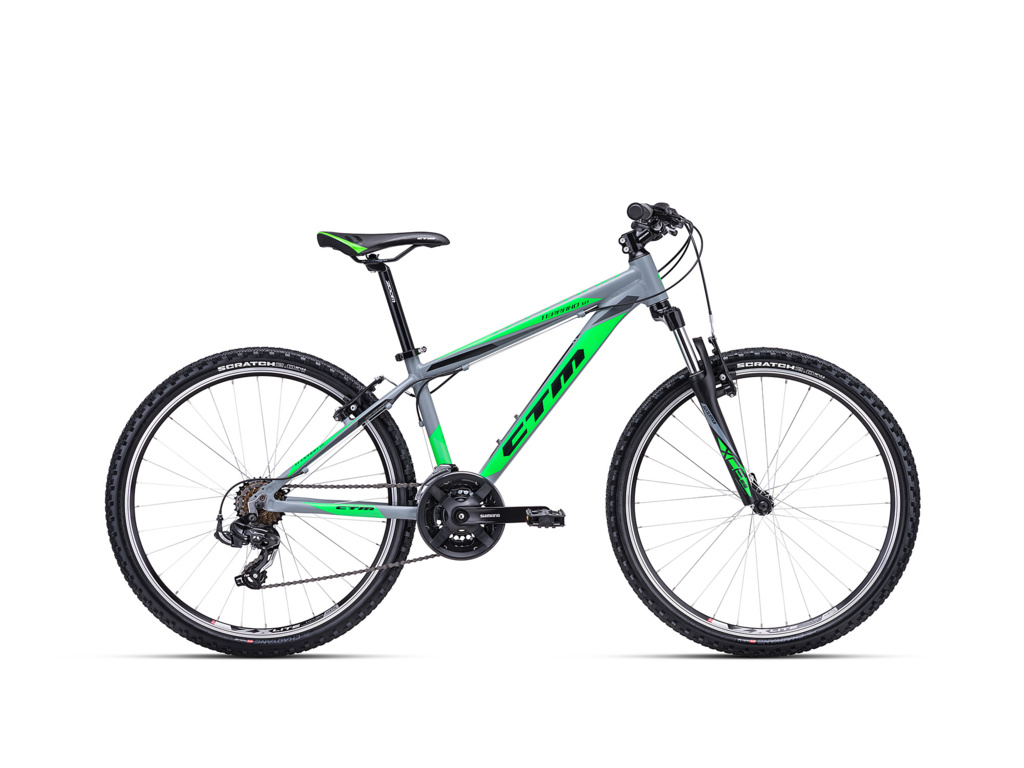 CTM Terrano 1.0 je horský bicykel vhodný na rekreačné a víkendové použitie. Ľahký hliníkový rám je vybavený odpruženou vidlicou Suntour, komponentmi Shimano s prevodmi 3x7 a ráfikovými brzdami ALHONGA.