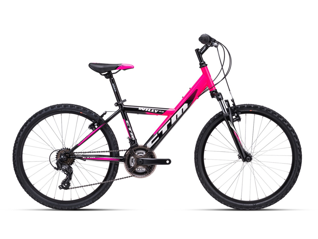 Detský bicykel CTM Willy 2.0 s 24" kolesami je vhodný pre deti vysoké 125 až 145 cm. Bicykel je vybavený oceľovým rámom, odpruženou prednou vidlicou Suntour, brzdami V-brake a komponentmi Shimano s prevodmi 3x6.