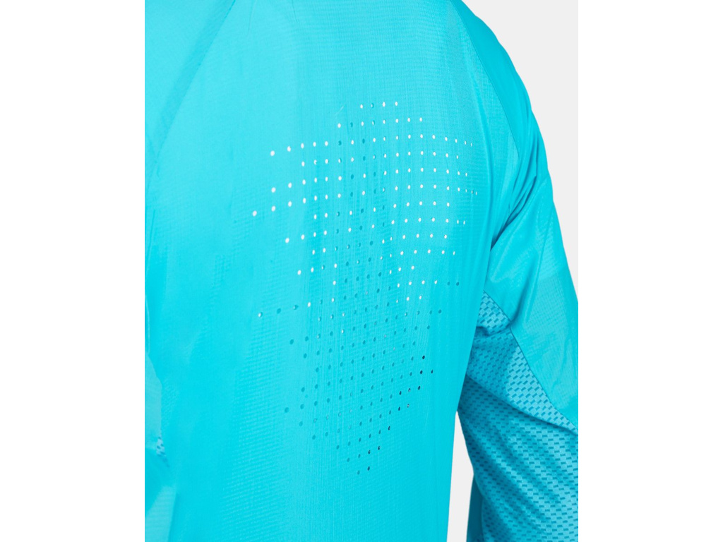 Celková hmotnosť bundy je iba 90 gramov vo veľkosti 36. Bundu ľahko zbalíte do bočného vrecka. V podpazuší a na bokoch je použitý tenký sieťovaný materiál, ktorý spolu s mikroperforáciou na chrbte zaručuje maximálnu priedušnosť. Vysoký golier je z vnútornej strany vystlaný rýchloschnúcim materiálom, ktorý dobre odvádza pot. Bunda má predĺžené rukávy s manžetou na palec a prestrihom na hodinky. Predný zips s krytkou brady je dvojcestný a poslúži na lepšie odvetrávanie. Voľnejší strih vás nebude obmedzovať v pohybe. Lemy rukávov a spodný lem krásne priliehajú. Na chrbte je použitá laserom rezaná mikroperforácia. Samozrejmosťou pri produktoch Kilpi sú výrazné reflexné prvky.