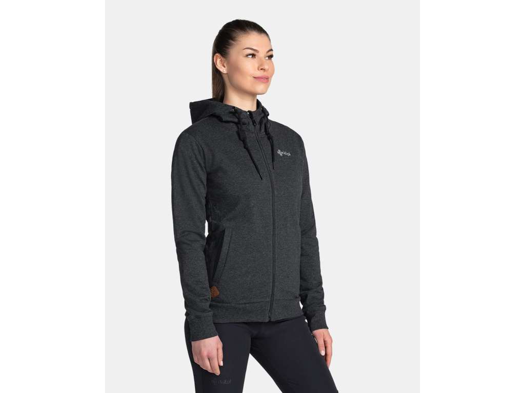Dámská bavlněná celorozepínací mikina Kilpi BERY-W má kapuci na stahování pomocí šňůrky, dvě kapsy a je vyšší u krku.