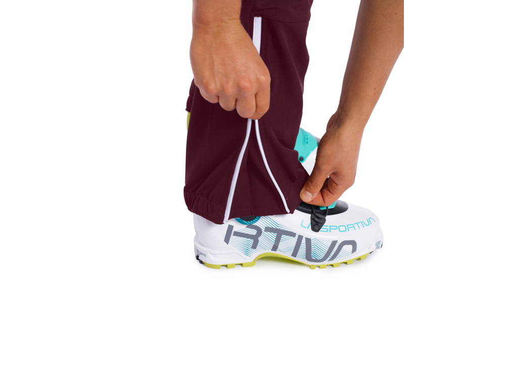 Nohavice kalhot ORTOVOX BERRINO PANTS W jsou skvěle přizpůsobeny pro kompatibilitu s lyžařskými boty. Pomocí zipu u kotníku je rozepneš a převlékneš přes lyžáky. Na oblast kotníků byl použitý velmi odolný softshell od značky Schoeller®, aby byly kalhoty odolné vůči ostrým hranám lyží nebo maček.