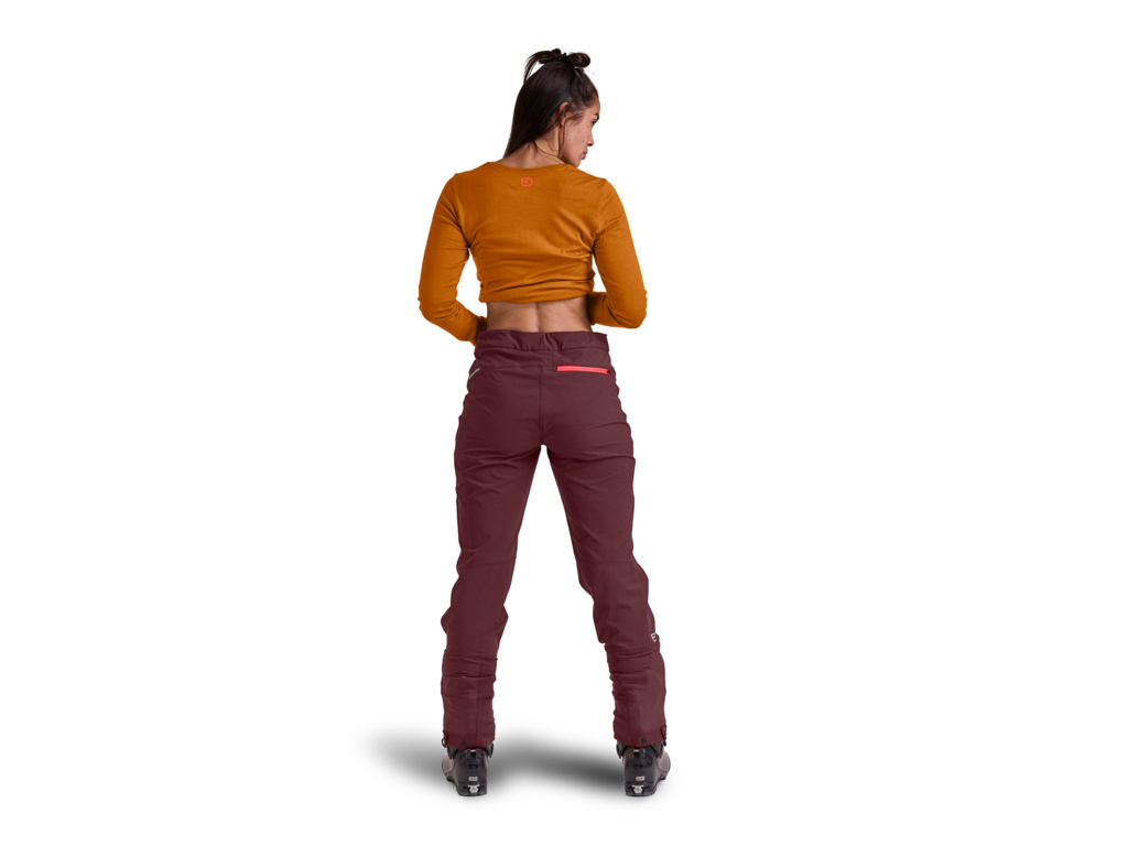 ORTOVOX Cevedale jsou dámské kalhoty, které se díky své neuvěřitelné odolnosti, pružnosti a technickým detailům hodí na jakékoli vysokohorské výpravy na lyžích i na laně. Materiál je zesílený v oblasti kotníků, kde je nejvíc namáhán při chůzi i lezení, nebo zde může dojít k prořezu mačkami či hranami lyží. Díky integrovaným návlekům na boty se na ně můžete spolehnout i v hlubokém sněhu a v nepříznivých povětrnostních podmínkách. Nový hybridní materiál MERINO AIRSOLATION zpracovaný pomocí technologie two-way stretch je odolný, vodoodpudivý, neprofoukne a díky žebrované konstrukci na vnitřní straně poskytuje optimální izolaci, o kterou se také stará vyčesaná merino vlna, která výrazně přispívá ke komfortu a odvodu potu. Tyto kalhoty přitom nevynikají pouze svými technickými parametry, ale navíc i skvěle vypadají. Model má na stehně estetickou kapsu z třívrstvého tradičního lodenu a dvě přední kapsy s podšívkou z Merino vlny na zahřátí rukou a jednu zadní kapsu. Veškeré zipy na kapsách jsou vyvedené v kontrastních barvách a doslova září.