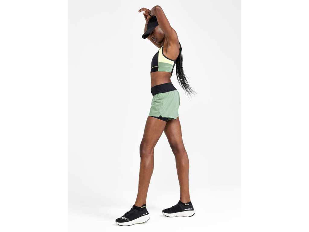 Dámske šortky CRAFT ADV Essence 2v1 s vnútornými funkčnými priedušnými boxerkami určené na beh a iné športové aktivity.