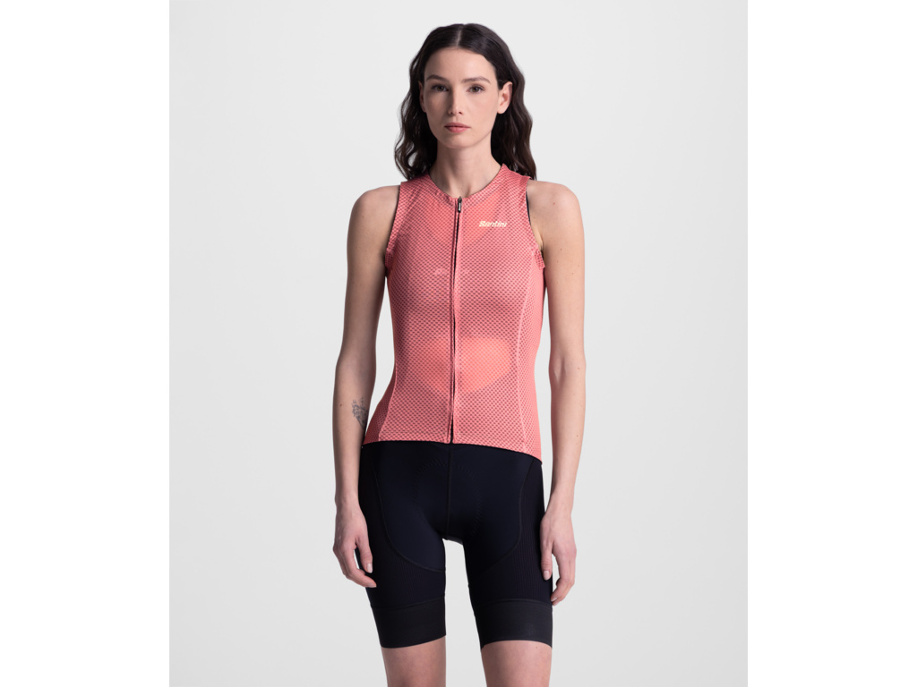 Dres bez rukávov SANTINI Opal s priliehavým strihom, sieťovaným materiálom a UV ochranou je ideálnou voľbou pre horúce letné jazdy – maximálna ventilácia, komfort a čistý športový dizajn.