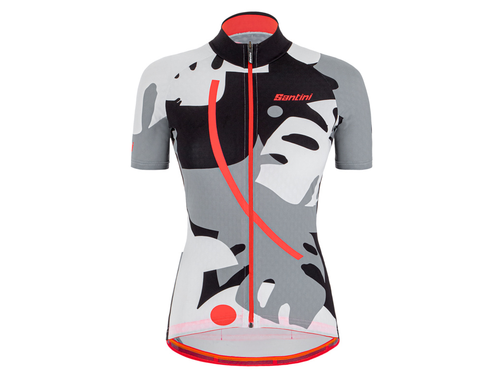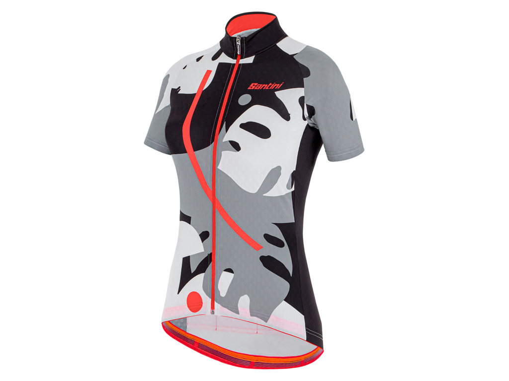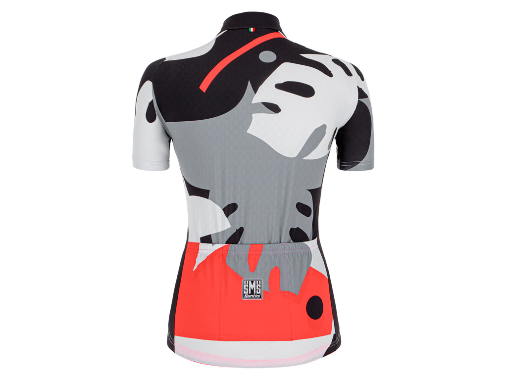 SANTINI Giada Maui Jersey je komfortný dámsky cyklistický dres so štýlovým vzorom a reflexnými detailami na chrbte pre lepšiu viditeľnosť na ceste. Je veľmi pohodlný, vyrobený z tkaniny z mikrovlákna, takže je aj priedušný a ľahký, preto sa hodí na tie najteplejšie vychádzky. Vďaka elastickému lemu okolo pása drží na svojom mieste a nevyhŕňa sa. A trojité zadné vrecko slúži na úchovu nevyhnutných maličkostí a vedie k nim pohodlný prístup.