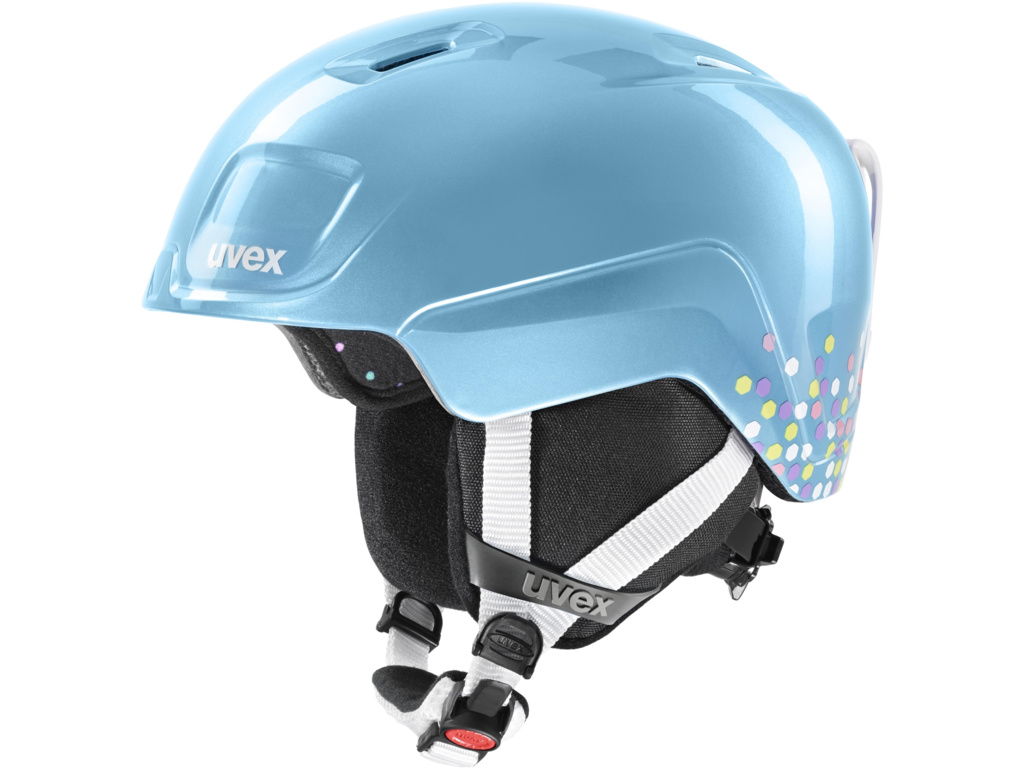 Dětská přilba UVEX HEYYA Blue Splash je navržena tak, aby kombinovala bezpečnost, pohodlí a snadné používání pro mladé lyžaře.