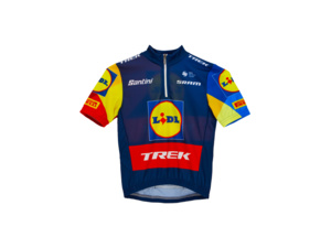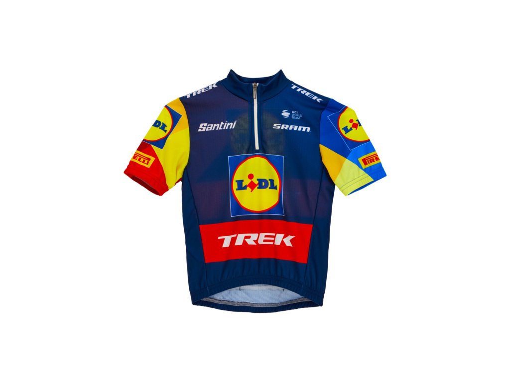 Dětský cyklistický dres z lehké a prodyšné tkaniny v barvách týmu Lidl Trek. Ideální dárek pro mladé šampióny.
