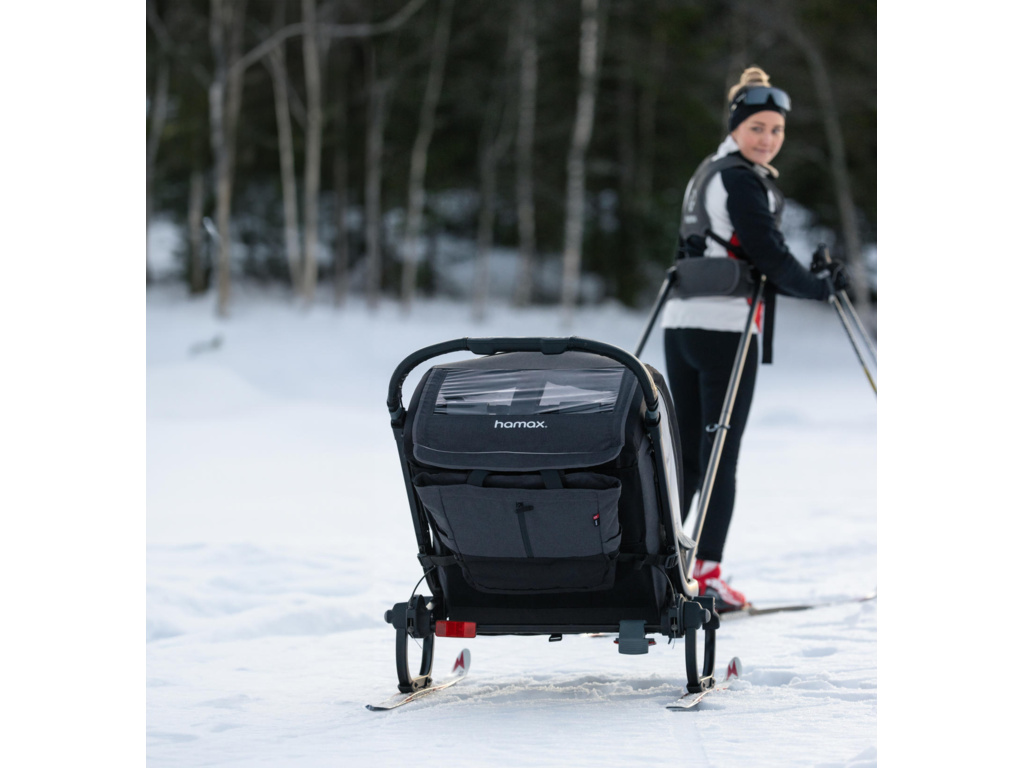 Vozík Hamax Cocoon kombinuje městskou eleganci s působivou univerzálností. Lze jej snadno použít jako vozík za kolo, kočárek, kočárek na jogging a sáňky.
