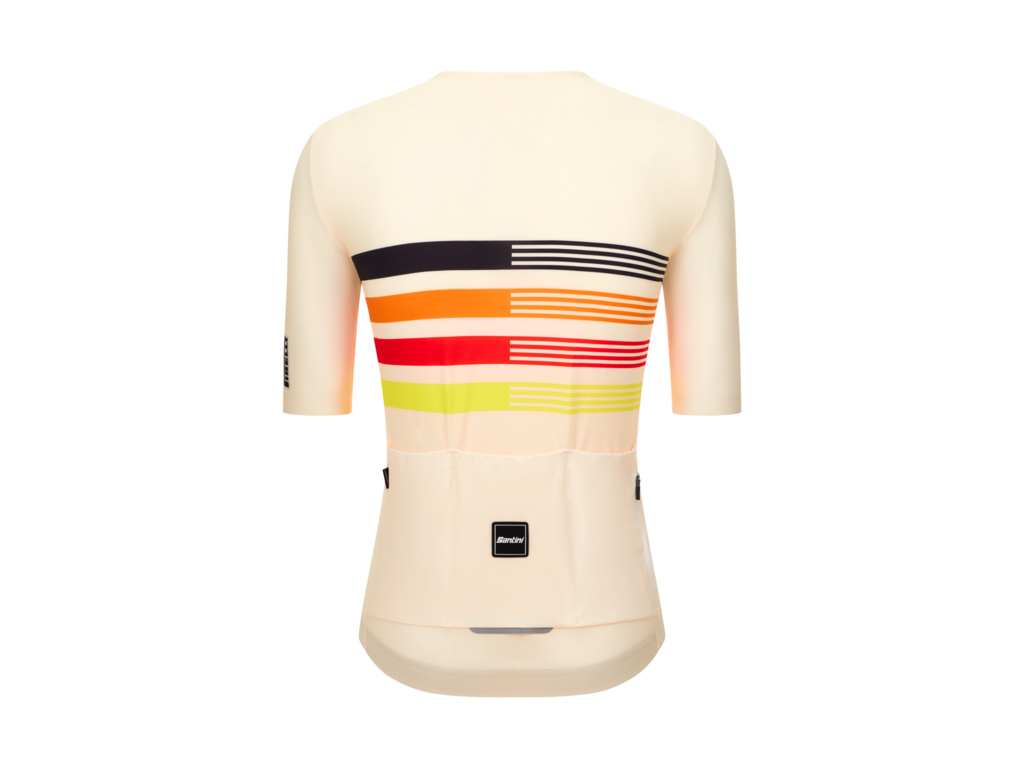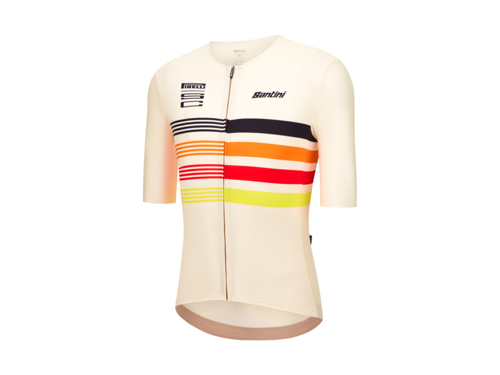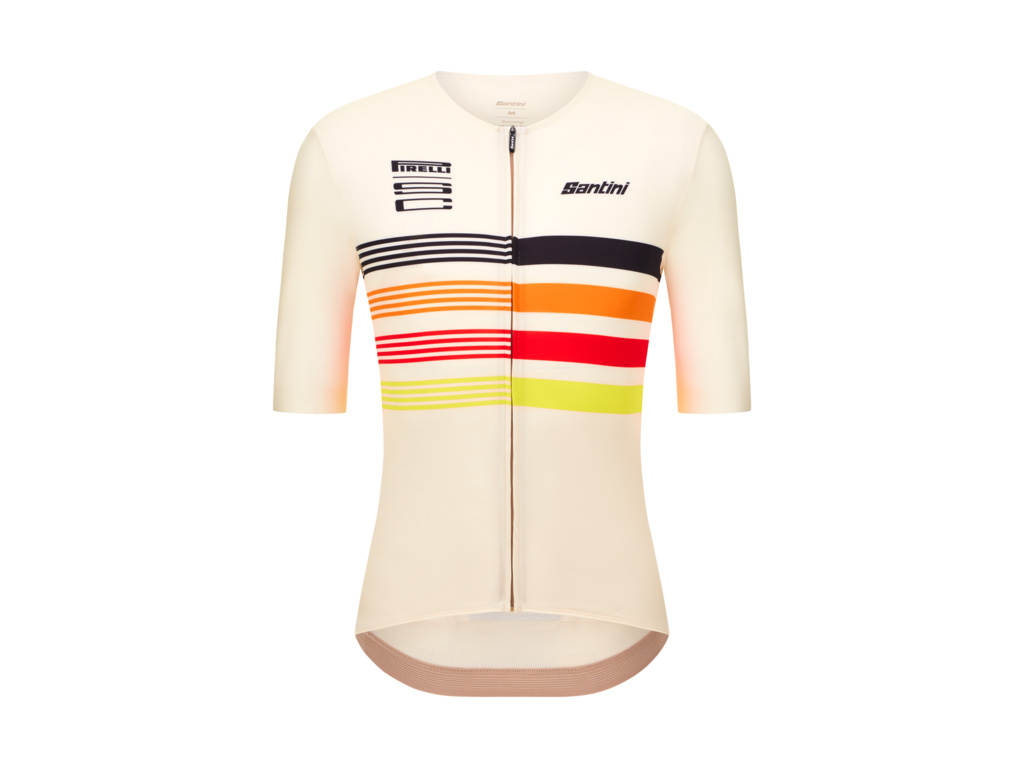 Dres SANTINI Pirelli Tape v bílém provedení představuje dokonalou fúzi výkonu a stylu. Na hrudi jej zdobí charakteristické barevné pruhy (oranžová, červená, žlutá), které skládají poctu historické reklamní estetice značky Pirelli. Díky unisex střihu Slim fit a raglánovým rukávům s neupraveným zakončením (raw-cut) dres perfektně přiléhá k tělu a snižuje odpor vzduchu.