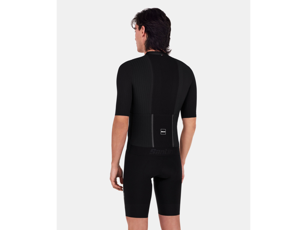 Pre dokonalú stabilitu počas jazdy je dres vybavený elastickým pásom so silikónovým gripom na chrbte a laserom strihanými rukávmi bez lemu. Tri laserom rezané zadné vrecká sa diskrétne prispôsobia telu, keď nie sú používané, čím zachovávajú čistý aerodynamický vzhľad. Bezpečnosť zvyšuje reflexný pás integrovaný do zadného elastického pásu, ktorý zlepšuje viditeľnosť na ceste.
