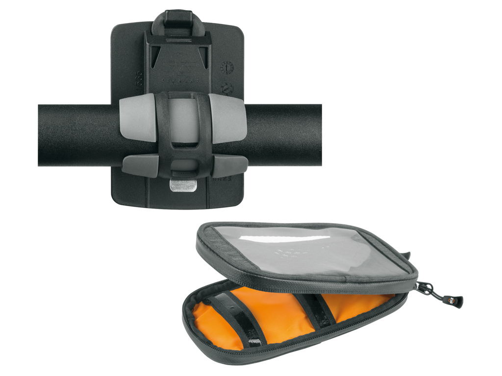 Nepremokavý držiak pre smartphony a GPS, vrátane priestrannej brašne so zatváraním na zips.