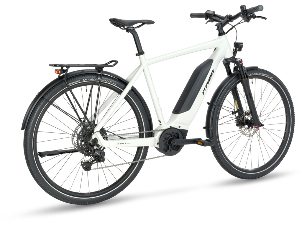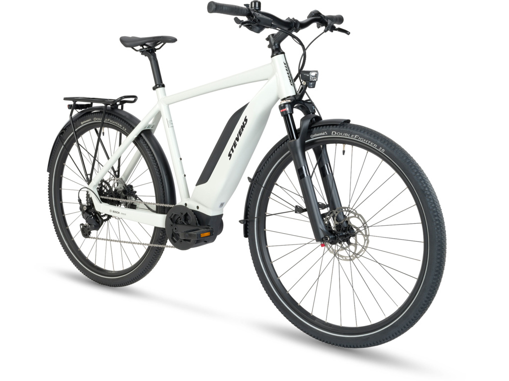 Ľahký a spoľahlivý touring elektrobicykel STEVENS E-4X Tour s pohonom Bosch Active Line Plus, 400Wh batériou a kompletnou výbavou na každodennú jazdu. Ideálna voľba na mestské jazdenie aj výlety.