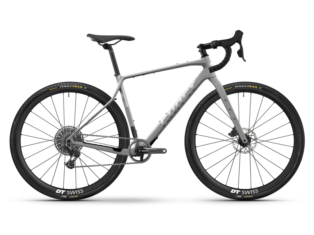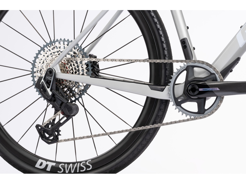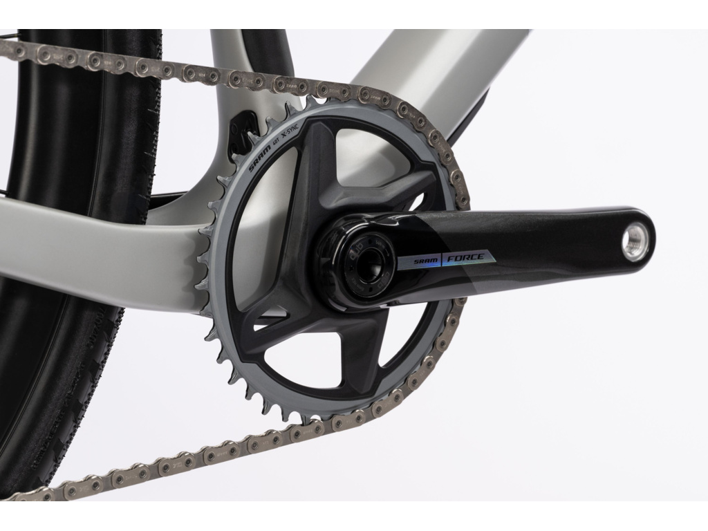 Asket CF LTD: Metalicky strieborný rám vybavený elektrickou sadou SRAM Force 1x12 a karbónovými kolesami DT Swiss GRC 1100 Dicut.