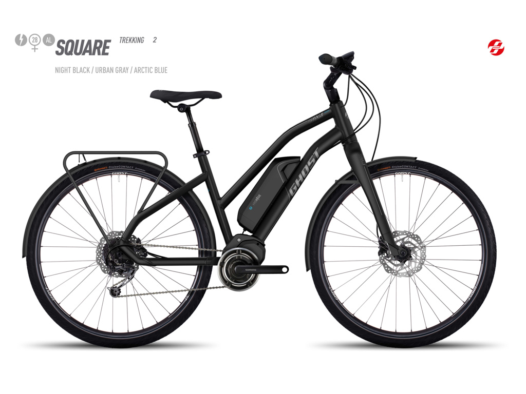 Ghost Hybride Square Trekking Lady je nový rad dámskych mestských elektrobicyklov vybavených spoľahlivými stredovými motormi Shimano Steps. Hybride Square Trekking 2 ponúka ľahkú pevnú vidlicu, spoľahlivé komponenty Shimano s 9 prevodmi a hydraulické kotúčové brzdy a dostatočne široké pohodlné pneumatiky Continental. Súčasťou sú aj štýlové blatníky a zadný nosič.Spoľahlivý stredový motor Shimano Steps poskytuje výkon 250 W a 50 Nm. Počas jazdy si môžete jednoducho vybrať z 3 režimov asistencie pomocou tlačidiel na riadidlách. Všetky údaje o jazde sa zobrazujú na ľahko čitateľnom displeji.Rámová batéria má kapacitu 400 Wh, čo bicyklu zvyčajne poskytuje dojazd od 80 do 150 km v závislosti od zvolenej úrovne asistencie.
