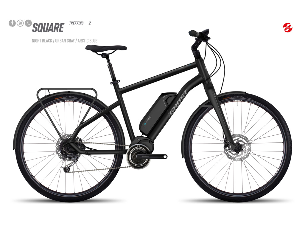 Ghost Hybride Square Trekking je nový rad trekingových elektrobicyklov vybavených spoľahlivými stredovými motormi Shimano Steps. Hybride Square Trekking 2 ponúka ľahkú pevnú vidlicu, spoľahlivé komponenty Shimano s 9 prevodmi a hydraulickými kotúčovými brzdami a dostatočne široké pohodlné pneumatiky Continental. Súčasťou sú aj štýlové blatníky a zadný nosič.Spoľahlivý stredový motor Shimano Steps poskytuje výkon 250 W a 50 Nm. Počas jazdy si môžete jednoducho vybrať z 3 režimov asistencie pomocou tlačidiel na riadidlách. Všetky údaje o jazde sa zobrazujú na ľahko čitateľnom displeji.Rámová batéria má kapacitu 400 Wh, čo bicyklu zvyčajne poskytuje dojazd od 80 do 150 km v závislosti od zvolenej úrovne asistencie.