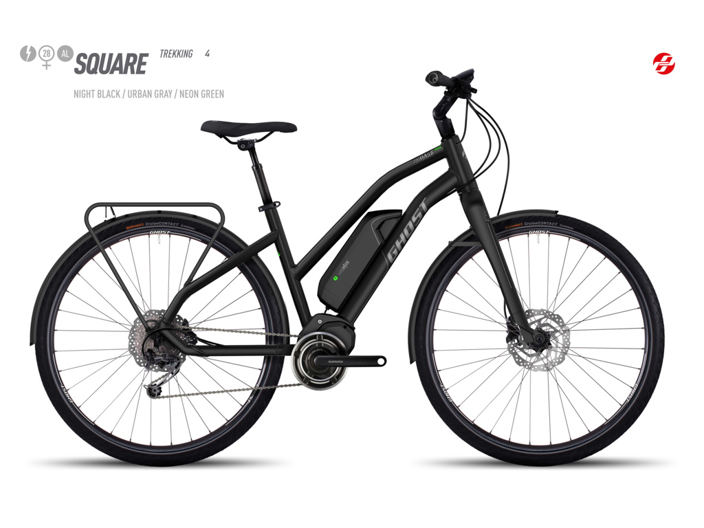 Ghost Hybride Square Trekking Lady je nový rad dámskych mestských elektrobicyklov vybavených spoľahlivými stredovými motormi Shimano Steps. Model Hybride Square Trekking 4 Lady je vybavený ľahkou pevnou vidlicou, spoľahlivými komponentmi Shimano XT/Deore s 10 prevodmi a hydraulickými kotúčovými brzdami a dostatočne širokými pohodlnými plášťami Continental. Súčasťou balenia je aj výkonné osvetlenie, stojan, štýlové blatníky a zadný nosič.Spoľahlivý stredový motor Shimano Steps poskytuje výkon 250 W a 50 Nm. Počas jazdy si môžete jednoducho vybrať z 3 režimov asistencie pomocou tlačidiel na riadidlách. Všetky údaje o jazde sa zobrazujú na ľahko čitateľnom displeji.Rámová batéria má kapacitu 400 Wh, čo bicyklu zvyčajne poskytuje dojazd od 80 do 150 km v závislosti od zvolenej úrovne asistencie.