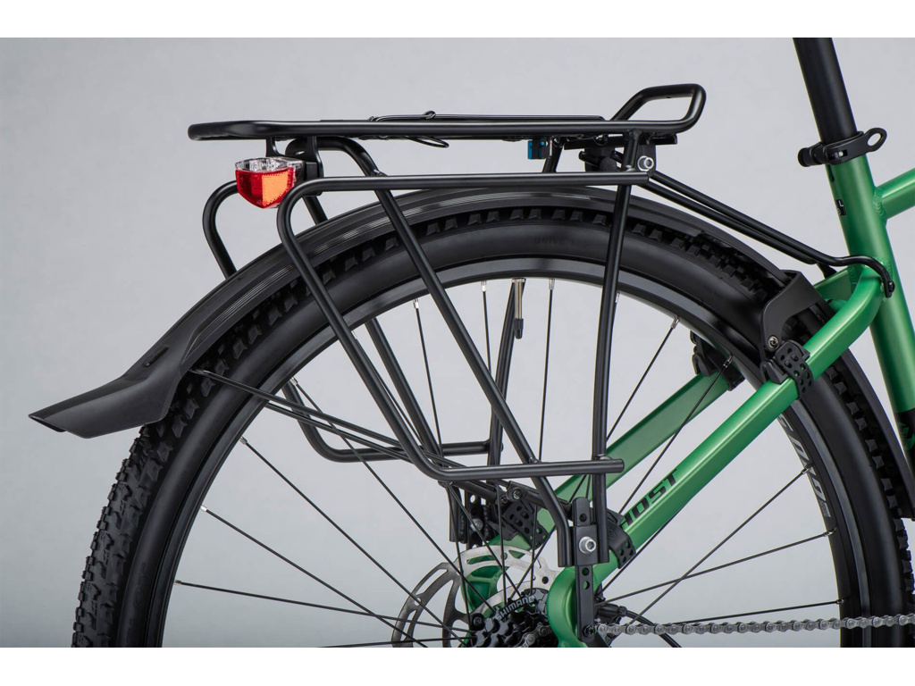 Model GHOST Kato EQ je rýchly, všestranný hardtail so športovou geometriou, ktorý sa hodí na cyklotrasy, ale zvládne aj náročné stúpanie v teréne. Ľahký hliníkový rám je osadený odpruženou vidlicou RST Blaze so zdvihom 100 mm, spoľahlivými hydraulickými brzdami TEKTRO, komponentmi SHIMANO s 3x8 prevodmi, kabelážou vedenou vnútrom rámu a českými plášťami MITAS. Modely EQ sa dodávajú s blatníkmi, zadným nosičom a svetlami. Vyberať môžete z niekoľkých farebných variantov a konfigurácií.