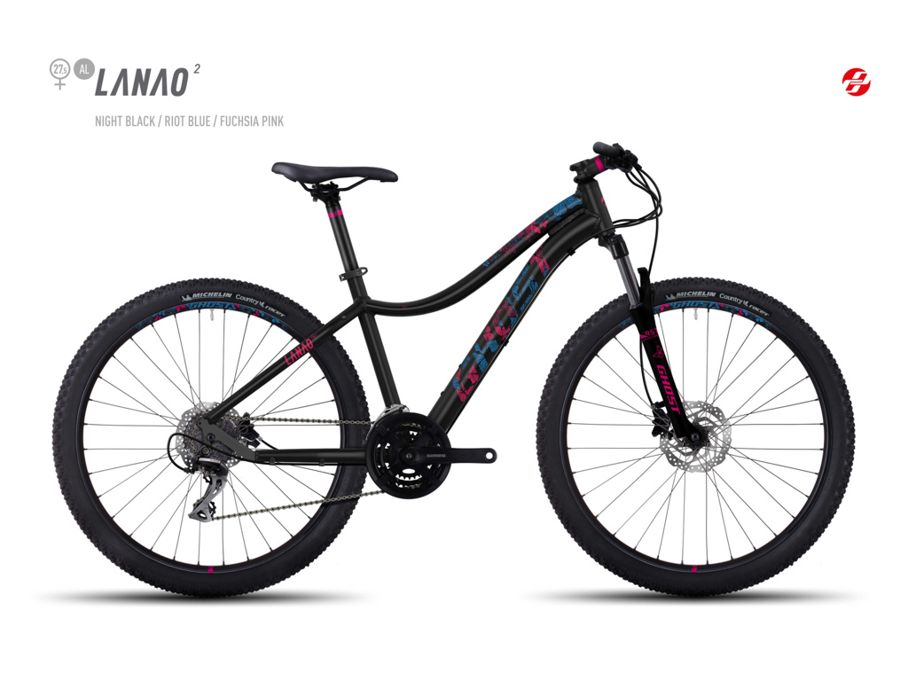 Dámsky horský bicykel Ghost Lanao 2 je vhodný na rekreačnú a každodennú jazdu. Ľahký, ale odolný hliníkový rám je vybavený vidlicou RST Blaze s uzamykaním z riadidiel a komponentmi Shimano s 3x8 prevodmi vrátane hydraulických bŕzd Shimano. Menšie 27,5-palcové kolesá sú obuté do obľúbených plášťov Michelin s jemným dezénom.