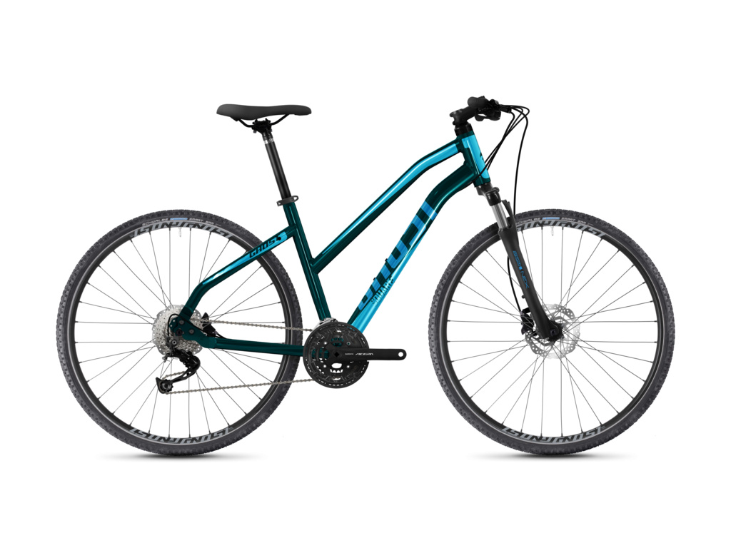 Model GHOST Square Cross má ľahký, napriek tomu pevný hliníkový rám a je osadený hydraulickou vidlicou SR Suntour SF14 NEX pre pohltenie nerovností a 9-rýchlostnou sadou Shimano Alivio RD-M3100.