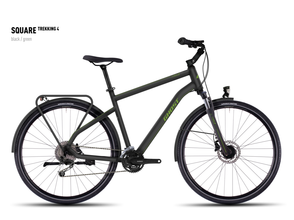 Obľúbený modelový rad trekingových bicyklov Ghost prešiel v roku 2016 tiež zmenou. Model Square Trekking 4 je vybavený odpruženou vidlicou s uzamykaním a spoľahlivými komponentmi Shimano 3x9 s hydraulickými brzdami. K dispozícii je kompletná výbava, ako sú blatníky, kvalitné osvetlenie, zadný nosič a stojan.