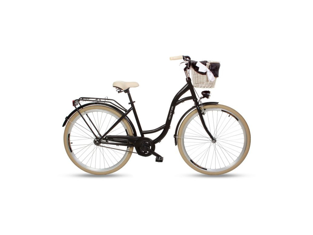 Elegantný mestský bicykel v retro dizajne, vhodný na jazdu po meste a na vidieku. Pevný oceľový rám je vďaka svojej zníženej konštrukcii prispôsobený na pohodlné nastupovanie a je vhodný pre výšku postavy od približne 160 do 180 cm. Súčasťou je predný kôš s dizajnovým obložením, kvalitné osvetlenie LED, blatníky, zadný nosič, stojan a bezpečnostný kryt reťaze.