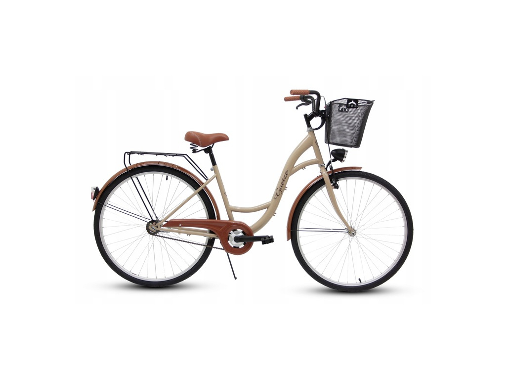 Elegantný mestský bicykel v retro dizajne, vhodný na jazdu po meste a na vidieku. Pevný oceľový rám je vďaka svojej zníženej konštrukcii prispôsobený na pohodlné nastupovanie a je vhodný pre výšku postavy od približne 160 do 180 cm. Súčasťou je predný kôš s dizajnovým obložením, kvalitné osvetlenie LED, blatníky, zadný nosič, stojan a bezpečnostný kryt reťaze.