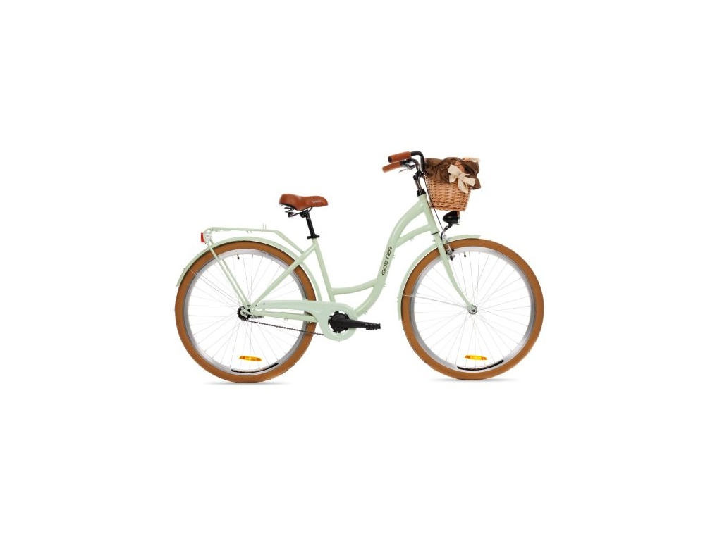 Elegantný mestský bicykel v retro dizajne, vhodný na jazdu po meste a na vidieku. Pevný oceľový rám je vďaka svojej zníženej konštrukcii prispôsobený na pohodlné nastupovanie a je vhodný pre výšku postavy od približne 160 do 180 cm. Súčasťou je predný kôš s dizajnovým obložením, kvalitné osvetlenie LED, blatníky, zadný nosič, stojan a bezpečnostný kryt reťaze.