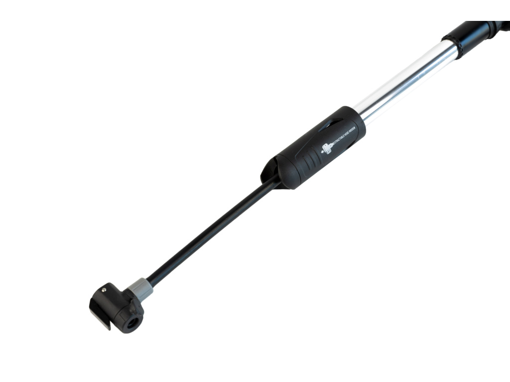 Ľahká pumpička s hliníkovým telom, ergonomickou plastovou rukoväťou a univerzálnou hlavicou pre všetky ventily. Štýlový čierny dizajn.
