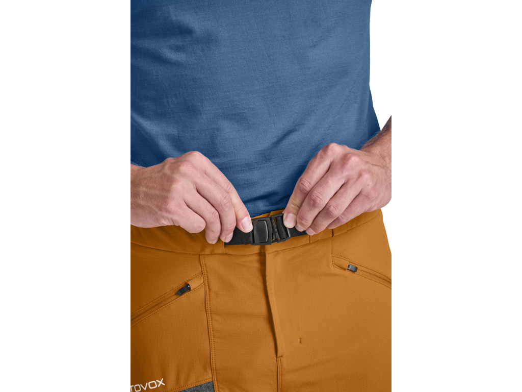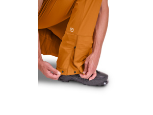 ORTOVOX Cevedale jsou pánské kalhoty, které se díky své neuvěřitelné odolnosti, pružnosti a technickým detailům hodí na jakékoli vysokohorské výpravy na lyžích i na laně. Materiál je zesílený v oblasti kotníků, kde je nejvíc namáhán při chůzi i lezení, nebo zde může dojít k prořezu mačkami či hranami lyží. Díky integrovaným návlekům na boty se na ně můžete spolehnout i v hlubokém sněhu a v nepříznivých povětrnostních podmínkách. Nový hybridní materiál MERINO AIRSOLATION zpracovaný pomocí technologie two-way stretch je odolný, vodoodpudivý, neprofoukne a díky žebrované konstrukci na vnitřní straně poskytuje optimální izolaci, o kterou se také stará vyčesaná merino vlna, která výrazně přispívá ke komfortu a odvodu potu. Tyto kalhoty přitom nevynikají pouze svými technickými parametry, ale navíc i skvěle vypadají. Model má na stehně estetickou kapsu z třívrstvého tradičního lodenu a dvě přední kapsy s podšívkou z Merino vlny na zahřátí rukou a jednu zadní kapsu. Veškeré zipy na kapsách jsou vyvedené v kontrastních barvách a doslova září.