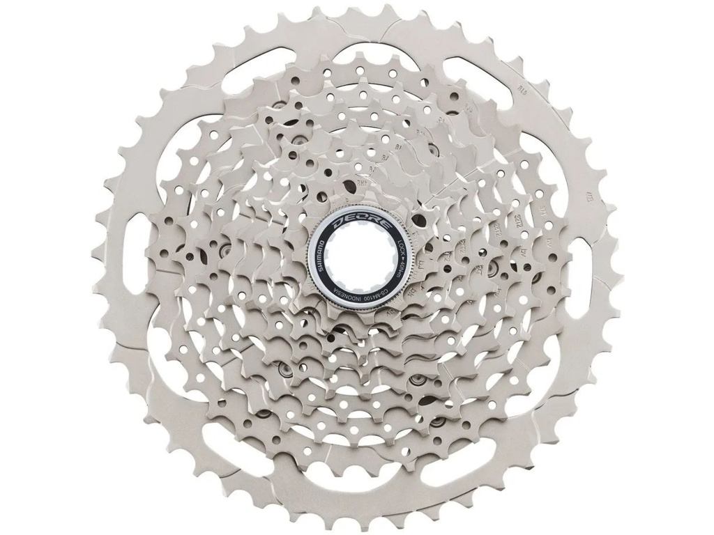 Nitovaná 10-rýchlostná oceľová kazeta z novej série Shimano Deore M4100 s niklovou povrchovou úpravou.