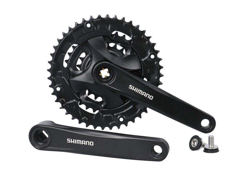 Kliky Shimano Altus FC-MT101 s krytem, vhodné pro 9/8 převodů a čtyřhranou osu.