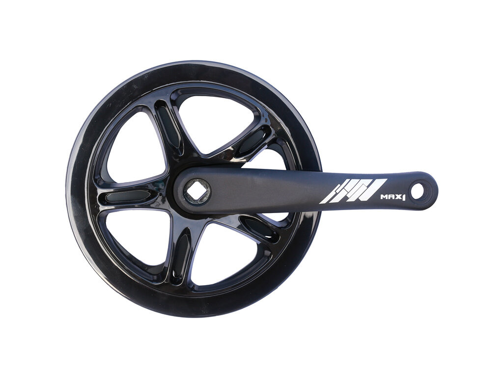 MAX1 Jednoduché kľuky s jednoprevodníkom určené pre mestské bicykle. Matné Al kľuky s oceľovou prehadzovačkou a lesklým plastovým krytom.