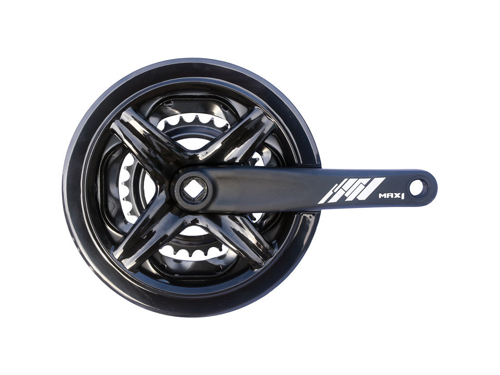 Kľuky MAX1 Tour s trojprevodníkom pre crossové bicykle. Matné Al kľuky s nitovanými oceľovými prevodmi a lesklým plastovým krytom.