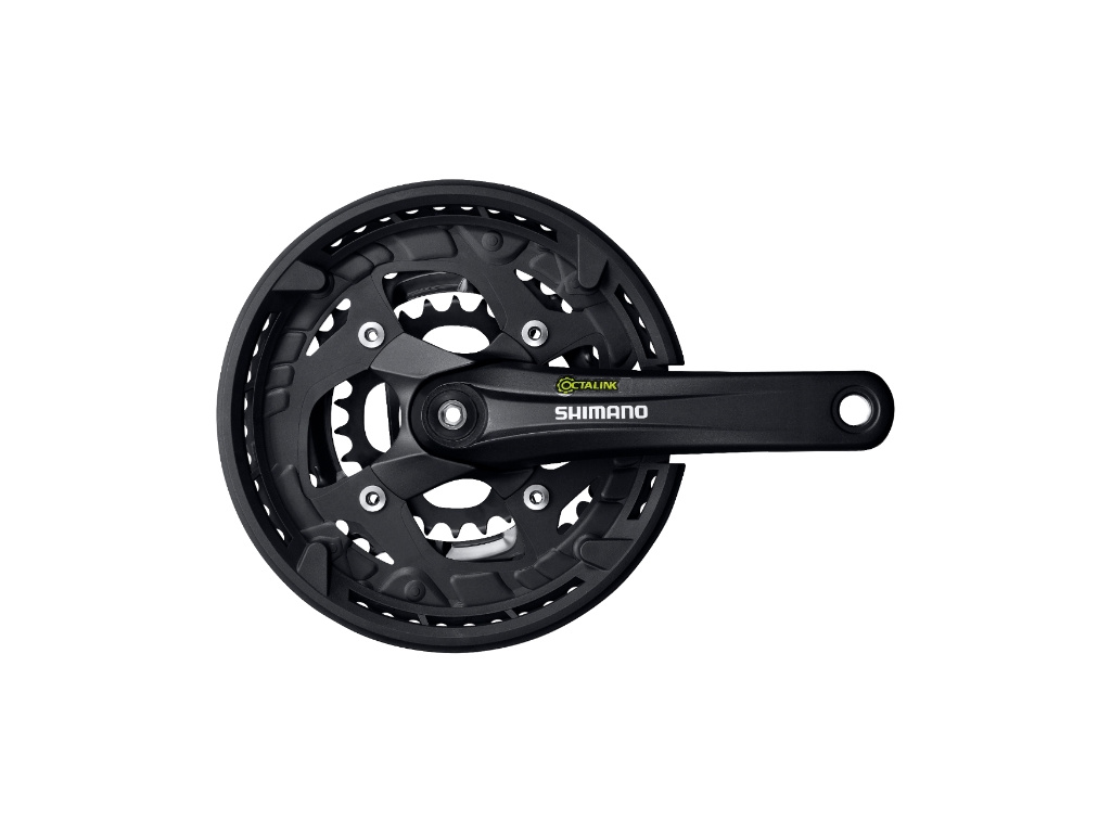 Oceľové trekingové kľuky SHIMANO FC-T4010 v čiernom prevedení s krytom pre 9-rýchlostnú kazetu s počtom zubov 48-36-26 v dĺžke 170/175 mm.