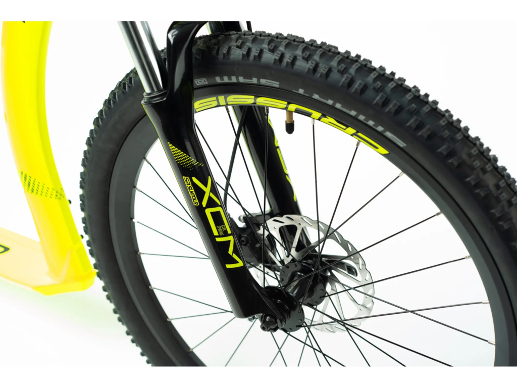 Hliníková kolobežka do terénu CROSS 6.2-1 na špičkových kotúčových hydraulických brzdách SRAM s priemerom kolies 26 a 20" a skvelou hmotnosťou 10,87 kg. Vhodná aj do náročnejšieho terénu alebo akčnej jazdy so psom.