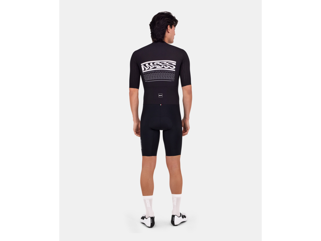 Cestná Lycrová kombinéza SANTINI MADSS, čo je skratka pre MEGA AERODYNAMIC SPEED SHELL, je majstrovským dielom z hľadiska aerodynamického výkonu pre pretekárskych cyklistov.