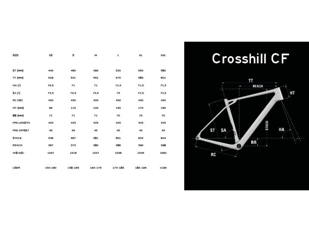 V rade Crosshill CF je sedem modelov, pričom dva majú odpružené vidlice so zdvihom 30 a 40 mm na náročnejšie použitie v horách alebo na kamenitých cestách. Nižšie modely sú vybavené mimoriadne pohodlnými hliníkovými riadidlami (rise: 12 mm, drop: 114 mm). Vyššie modely majú karbonové riadidlá, ktoré umožňujú športovejšiu pozíciu. Kabeláž vchádza do rámu už v predstavci, čo ničím nenarúša dokonalý vzhľad.