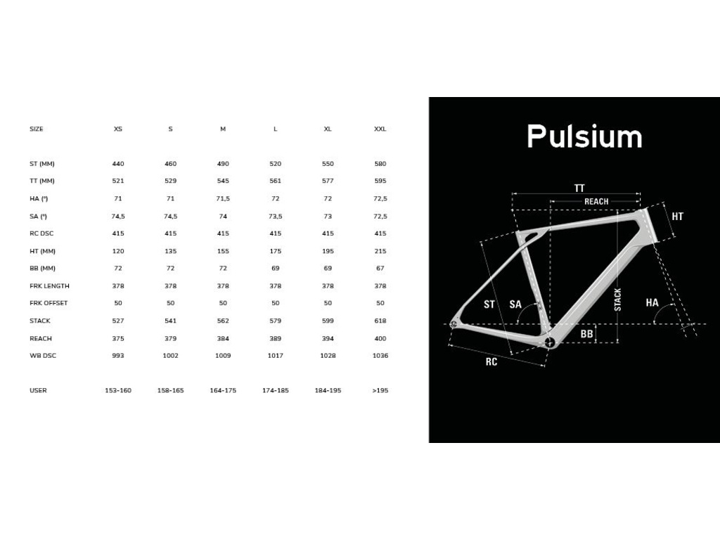 Najvyšší model Pulsium CF 8.0 má vo výbave DT Swiss karbónové ráfiky a karbónové riadidlá s predstavcom zo zliatiny. Na pomyselnom opačnom konci ponuky je Pulsium CF 5.0, ktorý je ako jediný z ponuky na mechanickej, ale dokonale spoľahlivej sade Shimano 105.