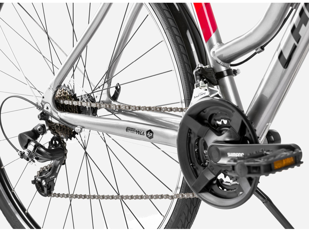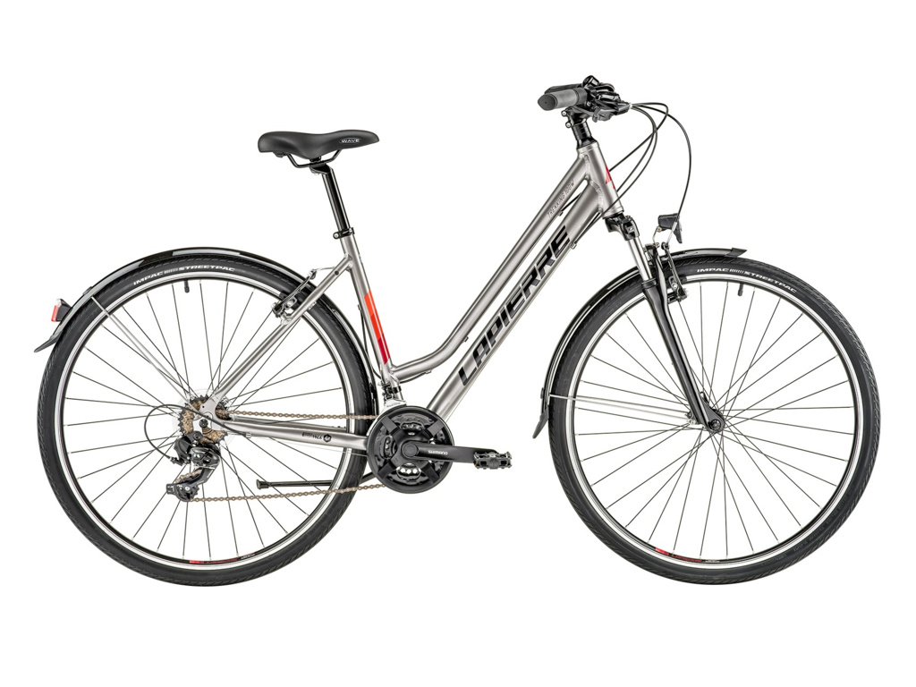 Dámsky trekingový bicykel LAPIERRE Trekking je tou pravou voľbou pre rekreačné jazdy po meste aj do prírody. Je vybavený množstvom praktických doplnkov, ktoré vám spríjemnia cestu. Výkonné osvetlenie sa postará o to, aby ste boli vidieť a zároveň ste mali dostatočný rozhľad. Nechýbajú blatníky ani stojan. Dochádzanie do práce aj do obchodu sa stane skutočným potešením vďaka pevnému a ľahkému hliníkovému rámu, pohodlnému sedlu SELLE ROYAL, kvalitným komponentom SHIMANO a odpruženej vidlici SUNTOUR, ktorá výborne absorbuje otrasy spôsobené nerovnosťami cesty.
