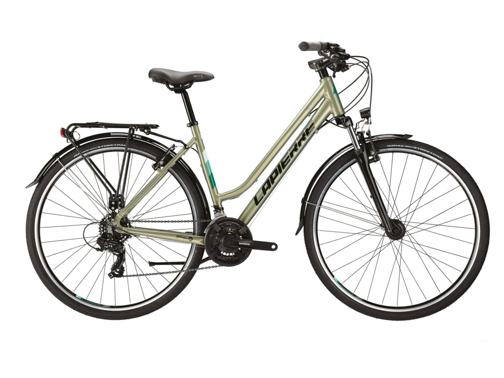 Dámsky trekingový bicykel LAPIERRE Trekking je tou pravou voľbou pre rekreačné jazdy po meste aj do prírody. Je vybavený množstvom praktických doplnkov, ktoré vám spríjemnia cestu. Výkonné osvetlenie sa postará o to, aby ste boli vidieť a zároveň ste mali dostatočný rozhľad. Nechýbajú blatníky ani stojan. Dochádzanie do práce aj do obchodu sa stane skutočným potešením vďaka pevnému a ľahkému hliníkovému rámu, pohodlnému sedlu SELLE ROYAL, kvalitným komponentom SHIMANO a odpruženej vidlici SUNTOUR, ktorá výborne absorbuje otrasy spôsobené nerovnosťami cesty.