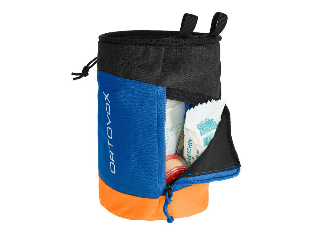 ORTOVOX Rock doc je lekárnička aj vrecko na magnézium v jednom. Nejedná sa o kompromis, ale o dve plnohodnotné vybavenie. Vrecko na magnézium má mäkké vnútro a prístup je dostatočne široký, aby vás neobmedzoval. Stiahnuť ho môžete pomocou šnúrky a plastovej spony. Súčasťou je aj pútko na kefku a dve pútka na opasok, aby sa vrecko neprevracalo a zostalo na svojom mieste. Lekárnička je integrovaná na strane bližšie k telu. Príjemne sedí a pri lezení ju ani nepocítite – náplň lekárničky váži iba 70 g. V prípade zranenia sa dostanete do lekárničky vďaka rozopnutiu v tvare „L“ veľmi rýchlo.