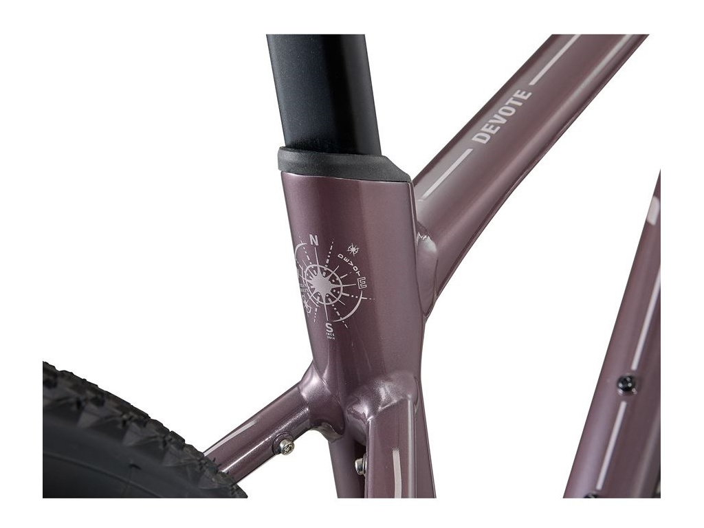 Základom tohto modelu je ľahký hliníkový rám ALUXX a celokarbónová vidlica Advanced Composite (stĺpik je tiež karbónový). Pre "čistý" vzhľad je tu integrovaná sedlovka a, samozrejme, vnútorné vedenie bowdenov. Rám je pripravený až na tri košíky na fľaše a je tu aj možnosť inštalácie predného a zadného nosiča na výlety s batožinami. V ráme a vidlici je viac priestoru pre širšie pneumatiky.Devote dokonale kombinuje tuhosť pre maximálnu efektivitu šliapania a poddajnosť pre vysoký komfort. Jeho špecifická geometria na štrk pozostáva najmä z výrazne zníženej hornej rámovej trubky a kratšej zadnej stavby. Výsledkom je presná ovládateľnosť, obratnosť a dokonalá kontrola nad bicyklom vo všetkých situáciách, od jazdy zo sedla v náročných stúpaniach až po rýchle zjazdy na nerovných cestách.Aby bola jazda po celom dni v sedle veľmi pohodlná, je tu niekoľko prvkov, ktoré zvyšujú komfort. Okrem nízko posadených sedlových vzpier je tu aj sedlovka D-Fuse, ktorá vďaka svojmu tvaru "D" mierne pruží pri zaťažení (rám