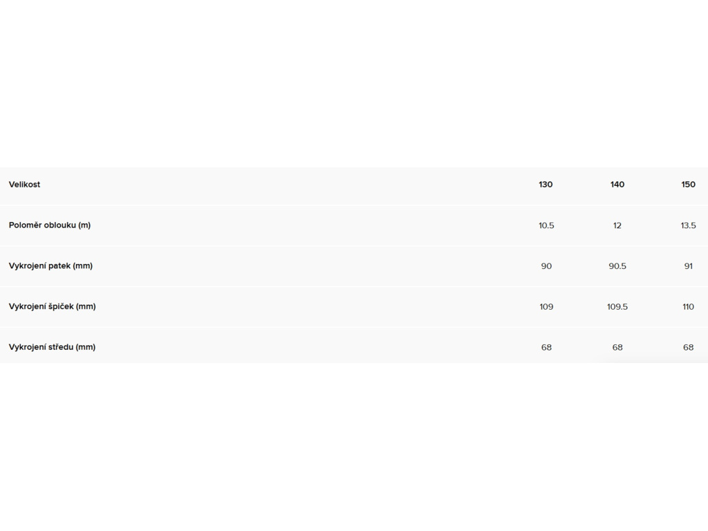 Hmotnosť jednej lyže: 1798 g (140 cm)
