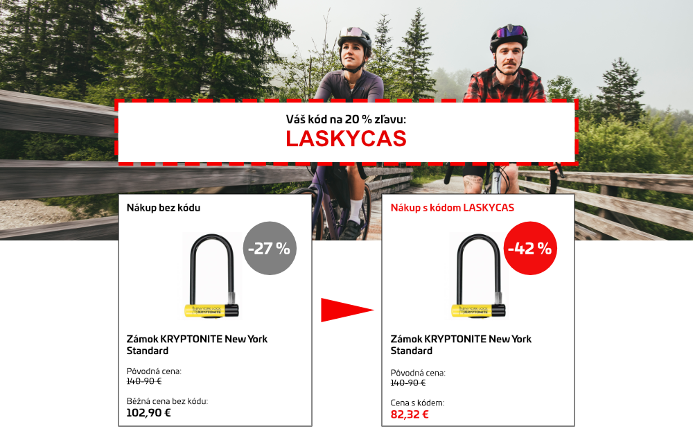Bicykel je láska a máj je lásky čas. Preto sme vybrali príslušenstvo, ktoré máte radi a zlacnili ho pre vás o 20 %. Stačí si vybrať produkt z ponuky nižšie, vložiť ho do košíka a do poľa pre zľavové kupóny v prvom kroku objednávky vpísať zľavový kód LASKYCAS. Po kliknutí na tlačidlo použiť sa zľava 20 % automaticky odpočíta. Zľavový kód je možné uplatniť aj na už skôr zľavnené produkty. Akcia platí do piatkovej polnoci, takže do konca akcie zostáva: