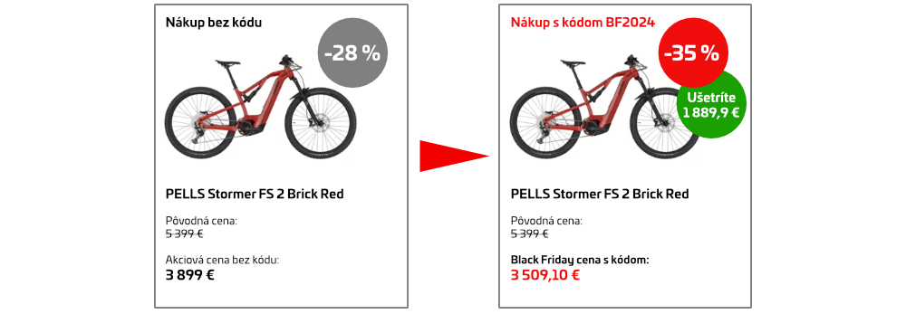 Zľavový kupón je platný od 18. 11. do 30. 11. 2024 alebo do vypredania zásob. Kupón je možné uplatniť na nákup v kategóriách bicykle, elektrobicykle, kolobežky, komponenty, príslušenstvo, prilby, okuliare a chrániče, obuv, tretry a oblečenie. Zľava sa nevzťahuje na ponuku testovacích bicyklov. Kupón nie je možné kombinovať s inými platnými zľavovými kupónmi. V jednej objednávke môžete uplatniť vždy len jeden zľavový kód.